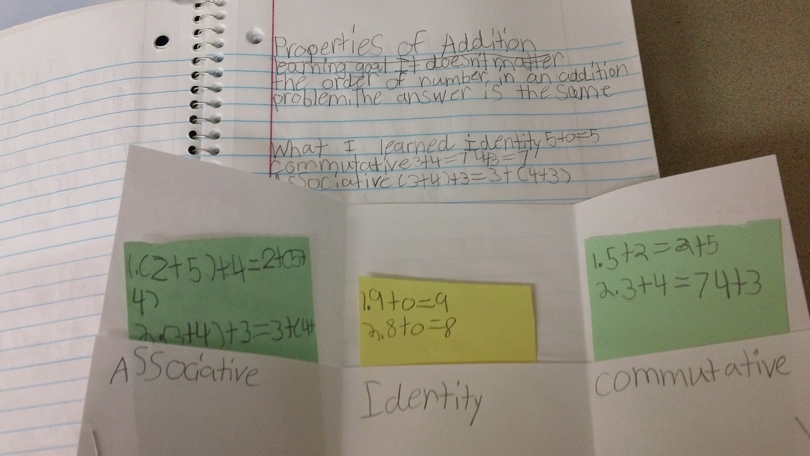 For the interactive part of the journal students created a trifold foldable. On each pocket students had to write one of the properties of addition: commutative, associative, and identity. I then gave each student colored cards to place inside each pocket. On these cards students had to write examples of math equations that went along with each particular property.