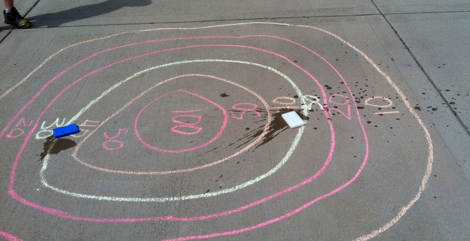 For this game you will need sidewalk chalk, a bucket of water, and 3 sponges. I drew a bullseye on our driveway and a box for my kiddos to stand in. They had 3 chances to throw the sponges and tally up their score. This was perfect math practice for my 7 year old!
